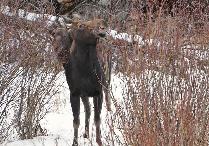 Keywords: moose cow female grazing wildlife animal nature wilderness mammal winter looking outdoors snow portrait