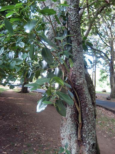 | Keywords: MoretonBayNaturalisedNZ.jpg An increasingly common sight in northern New Zealand A young plant of the Australian banyan-type fig Ficus macrophylla Moreton Bay Fig has started life as an epiphyte on a Kōwhai tree Sophora sp in Cornwall Park Auckland New Zealand The seed from which this plant grew must have been deposited here by a bird that ate the fruit from one of the very large Moreton Bay Figs that grow nearby in this park Ficus macrophylla is commonly cultivated in northern New Zealand It has now acquired its pollinating wasp Pleistodontes froggatti apparently by long-distance dispersal The size and vigour of this fig and its lack of natural enemies notably an immunity to possum browsing indicate that it may be able to invade forest and other native plant communities The Moreton Bay Fig has been found growing on both native and introduced trees in Auckland Own 2007-03-05 Kahuroa Epiphytes Files by User Kahuroa Strangler figs Kahuroa |