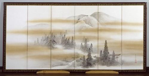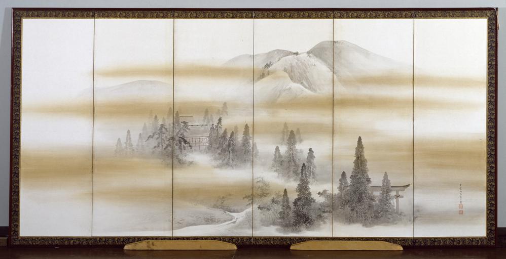 Keywords: Mori Kansai - Kamigamo Shrine in Summer - Walters 35147.jpg The Kamigamo Shrine is the oldest Shinto shrine in the former Japanese capital of Kyoto It is dedicated to the deity Kamo-wake-ikazuchi who appeared miraculously to a daughter of the ruling clan while she was performing a purification ritual in the Kamo River The deity was initially enshrined at the top of Mount Ko seen in the distance but was transferred to this 7th-century building during the Heian period The mate to this screen also in the Walters' collection 35 148 depicts the Byodo-in a famous Buddhist temple in the nearby town of Uji between 1860 1870 Edo-Meiji ink and gold wash on paper with hints of color cm 47 136 5 accession number 35 147 35616 Dealer Osaka Toyobi Far Eastern Art Dr Frederick Baekeland and Joan D Baekeland 1987-1988 mode of acquisition unknown Walters Art Museum 1989 by purchase Museum purchase with funds provided by the W Alton Jones Foundation Acquisition Fund 1989 Signature Lower right side of righthand panel Kansai Sho O Mori Koshuka; Seal Tachibana Koshuka in Jinichi Shiyo place of origin Kyoto Japan Walters Art Museum license 2D Japanese paintings in the Walters Art Museum Mori Kansai Media contributed by the Walters Art Museum needs category review