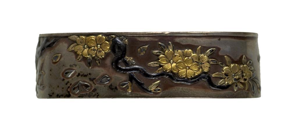 Keywords: Morikawa Toshikage - Fuchi with Cherry Tree in Bloom - Walters 5111982A - Back.jpg The fuchi is decorated with the trunk and branches of a cherry tree in full bloom The tree is made of black shakudo with the blossoms in gold and silver Cherry blossoms are a celebrated symbol of spring This is part of a mounted set 2nd half Other date century 19 late Edo-Meiji silver shakudo gold shibuichi cm 4 accession number 51 1198 2A 29005 Henry Walters Baltimore date and mode of acquisition unknown Walters Art Museum Henry Walters Acquired by Henry Walters Signature Hôshindai Toshikage place of origin Edo present-day Tokyo Japan Walters Art Museum license Fuchi in the Walters Art Museum Morikawa Toshikage Media contributed by the Walters Art Museum needs category review |