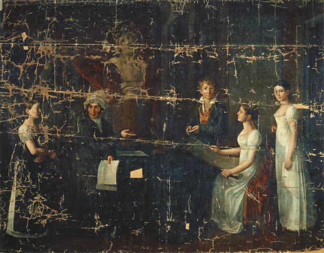 Keywords: Morkov Family Portrait2.jpg ru 2-й фамильный по т ет кисти В А Т опинина аписан в 1815 году ыне сбе егается в запасниках Т етьяковской гале еи в пов ежденном состоянии Пе сонажи изоб ажены в нату альную величину За столом сидит исуя 3-я дочь И И о кова г афиня Ва ва а за ее спиной стоит внучка гуве нантки m-elle Боцигети сп ава от них стоит т етий сын И И о кова г аф А кадий Слева за столом сидит сама гуве нантка Боцигети а сп ава от нее четве тая дочь И И о кова г афиня а ия 1815 абота взята с https //vk com/club52196838 Creator Vasily Tropinin other versions Т етьяковская галле ея cc-zero Uploaded with UploadWizard 1815 portrait paintings Family portraits by Vasily Tropinin Damaged paintings