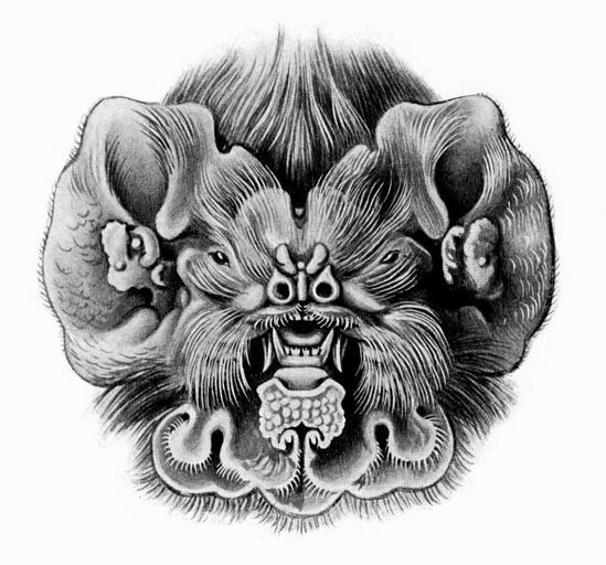 | Keywords: Mormoops blainvillii.jpg Mormoops blainvillei <small> Peters </small> Mormoops blainvillii <small>Leach 1821</small> head from front Antillean Ghost-faced Bat Detail of the 67th plate from Ernst Haeckel's Kunstformen der Natur 1904 1904 creator Ernst Haeckel Haeckel Chiroptera jpg PD-old Bats in art Kunstformen der Natur - derivative Mormoops blainvillii Bat heads |