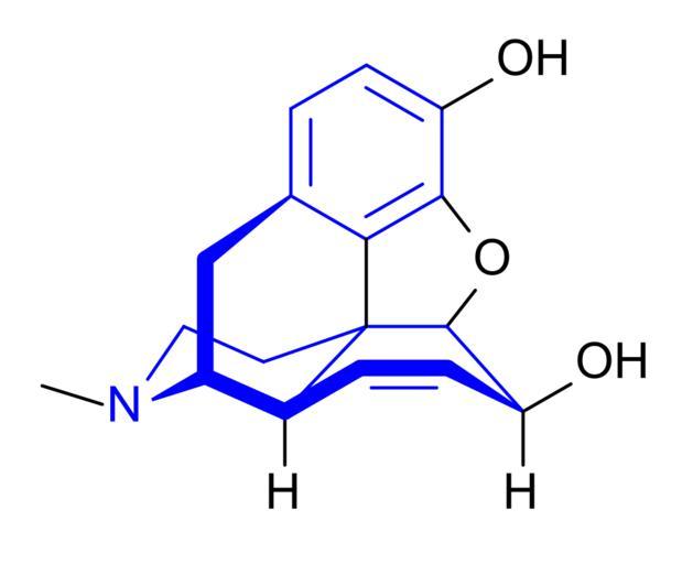 Keywords: Morphine stereo structure.svg validSVG Created with BKchem 001 -check morphine correct 3D configuration The benzylisoquinoline backbone is shown in blue Own Anypodetos 2008-09-01 Morphine Opiates