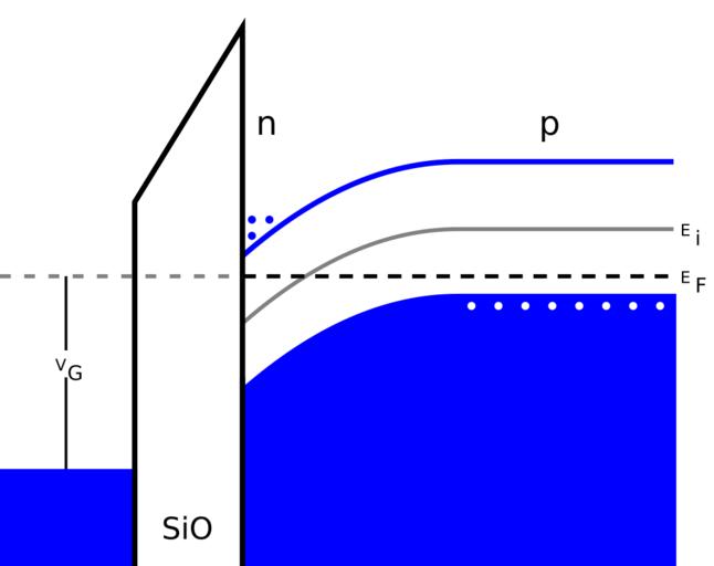 Keywords: MOS band bending.svg en Band bending in an n-channel MOSFET at inversion own Pieter Kuiper 2009-10-27 Created with Text Editor Metal-oxide-semiconductor band diagrams