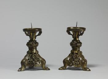 Keywords: Mosan Workshop - Pair of Altar Candlesticks - Walters 54426, 54427 - Profile.jpg Both of these candlesticks have three feet formed like winged dragons In between them human figures with outstretched arms stand on grotesque heads amidst vine trellises At the top small bird-like creatures support the wax pan The intricate woven style of this candlestick was widely popular in Belgian German and English regions late Other date century 12 Medieval gilt bronze 54 426 H with prong 6 9/16 x W at base 4 1/2 in 16 6 x 11 5 cm ; 54 427 H with prong 6 7/16 x W at base 4 5/8 in 16 3 x 11 8 cm accession number 54 426 54 427 77442 Henri de Lannoy Paris Collection Dietz-Coblenz Henri Daguerre Paris Henry Walters city Baltimore Walters Art Museum Henry Walters Acquired by Henry Walters 1925 place of origin Limoges France Walters Art Museum license Medieval metalwork in the Walters Art Museum Metalwork by Mosan workshops Media contributed by the Walters Art Museum needs category review |