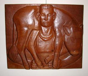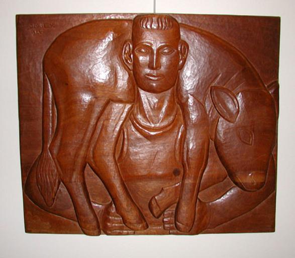 Keywords: Moscophorous-1 copy.jpg en Photo of wood carving produced by the sculptor John Carl Ely Photo DF Plummer 2003-09-14 Wood carving by John Carl Ely; 35 x 30 ; teak ; dated 1928 Wooden reliefs