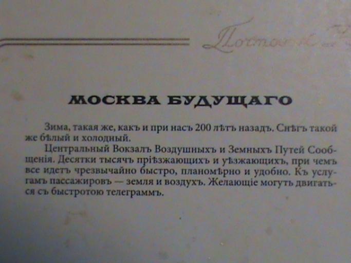 Keywords: Moscow in XXIII Century. Central Air Vokzal. 1914 B.jpg Moscow in XXIII Century Central Air and Land Vokzal Russian Empire postcard Einem Factory 1914 Moscow Side B Почтовая ка точка из се ии осква в 23 веке шоколадной фи мы Эйнем 1914 года - Цент альный Вокзал Земных и Воздушных Путей Сообщения Об атная сто она Текст «Зима такая же как и п и нас 200 лет назад Снег такой же белый и холодный Цент альный Вокзал Земных и Воздушных Путей Сообщения Десятки тысяч п иезжающих и уезжающих все идет ч езвычайно быст о планоме но и удобно К услугам пассажи ов земля и воздух Желающие могут двигаться с быст отою телег амм» A reproduction of the postcard dated early 20th century photo / Реп одукция почтовой ка точки 1914 года фото бумажной ве сии 1914 unknown and is not indicated on the postcard / на отк ытке не указан PD-old PD-RusEmpire Moscow in XXIII Century fiction