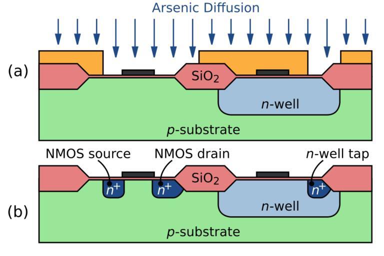 | Keywords: MOSFET Manufacture - 4 - n+ diffusion.svg Complementary metal oxide-semiconductor CMOS manufacture process A cross-section of the manufacture of a CMOS inverter <br> Stage 4 n+ diffusion own 2009-11-16 Inductiveload Own work all rights released Public domain CMOS manufacture |