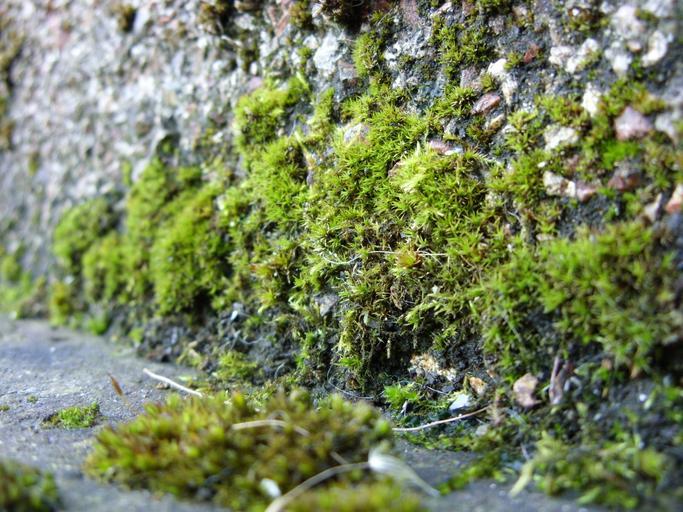 Keywords: moss mosses growing plant green stone wall texture gnarled gravel