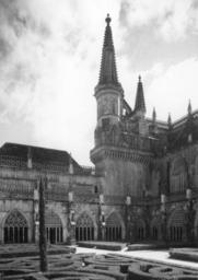 | Keywords: arquitectura gótico portugal batalha mosteiro santa vitória fundação calouste gulbenkian fundaçãocaloustegulbenkian maria pia mariapia black and white blackandwhite mário tavares chicó máriotavareschicó mário novais márionovais gótica biblioteca de arte bibliotecadearte black and white Claustro real. Fotógrafo: Mário Novais, 1899-1967. Orientador científico: Mário Tavares Chicó, 1905-1966. Data aproximada da produção da fotografia original: 1954. O Mosteiro da Batalha é o mais importante símbolo da Dinastia de Avis. Ele foi construído por iniciativa de D. João I, na sequência de um voto à Virgem, caso vencesse a Batalha de Aljubarrota (1385). Ao longo do século XV, praticamente todos os monarcas aqui deixaram a sua marca. O arranque das obras deu-se em 1388 e foi conduzido por Afonso Domingues, que se manteve à frente do estaleiro até 1402, ano em que faleceu. A ele se atribui o plano geral da construção e o grande avanço dos trabalhos na igreja e no claustro. Não terá tido tempo de executar a fachada principal nem o abobadamento do templo, deixando igualmente inacabado o claustro. A magnífica igreja de três naves e transepto saliente por si delineada, com cabeceira de cinco capelas, sendo a central de duplo tramo e terminação poligonal, terá sido o ponto alto da sua carreira, mas revela bem o nível ainda algo arcaizante da arquitectura portuguesa de finais do século XIV, alheia aos progressos do Gótico Flamejante, que tanto iria marcar a segunda fase do monumento. Com efeito, a partir de 1402, a chefia do estaleiro foi entregue a Huguet, arquitecto de provável origem catalã que inaugurou, entre nós, o tardo-gótico. Documentado à frente do projecto até 1438, a ele se deve o abobadamento dos espaços da igreja e da Sala do Capítulo (onde experimentou, pela primeira vez, uma abóbada estrelada), a construção da Capela do Fundador e, ainda, o início das obras das Capelas Imperfeitas, bem como a conclusão da fachada principal, onde sobressai o portal axial. Este, é delimitado por um arco canopial que integra os escudos de D. João I e de D. Filipa. No tímpano, exibe-se Cristo em Majestade ladeado pelos Evangelistas e as arquivoltas são repletas de figurações que continuam pelas estátuas-colunas, ao abrigo de um complexo programa iconográfico. Mas a mais emblemática obra de Huguet é a Capela do Fundador. Ela foi concebida para panteão régio e sabemos que já se encontrava em obras em 1426. É um compartimento quadrangular que se adossa aos três tramos ocidentais da fachada lateral Sul e integra, ao centro, um esquema octogonal de suportes onde descarrega a abóbada estrelada, solução primeiro experimentada em Inglaterra, mas rapidamente difundida pela Europa. No circuito interior desta capela, colocou-se o túmulo duplo de D. João I e de D. Filipa, realização igualmente sem antecedentes no nosso país e que resulta de uma nítida influência da tumulária inglesa. Na capela repousam também os filhos do casal régio (como D. Henrique e o regente D. Pedro), de acordo com a decisão testamentária de D. João I em fazer deste espaço um efectivo panteão. Em 1436, D. Duarte decidiu edificar uma capela funerária para si próprio. O projecto então concebido por Huguet foi o mais arrojado da sua carreira na Batalha, privilegiando uma planta circular que, todavia, não viria a ser concluída pelo falecimento do mestre dois anos depois. Desta forma, e não obstante a intervenção de Mestre Martim Vasques, a construção cessou até ao reinado de D. Manuel e, mesmo nessa altura, não foi concluída, razão de esta parcela ser conhecida como as Capelas Imperfeitas. No reinado de D. Afonso V, edificou-se o segundo claustro do mosteiro. Ele resulta da intervenção do arquitecto Fernão de Évora e, estilisticamente, é uma obra que contraria o tardo-gótico de raiz flamejante, tendo-se optado deliberadamente pela austeridade arquitectónica, que rejeita até a inclusão de capitéis a marcar o arranque dos arcos. A Batalha teve outras fases construtivas igualmente relevantes, como o Manuelino ou o Renascimento. Todavia, a mudança dinástica verificada com D. Manuel privilegiou outros locais e, só no século XIX, o Mosteiro voltou a ser intervencionado, desta vez com o objectivo de restaurar o conjunto, campanha que se prolongou por meio século. (Fonte: IPPAR - tinyurl.com/5dmlfe) [CFT015.174.ic] Claustro real. Fotógrafo: Mário Novais, 1899-1967. Orientador científico: Mário Tavares Chicó, 1905-1966. Data aproximada da produção da fotografia original: 1954. O Mosteiro da Batalha é o mais importante símbolo da Dinastia de Avis. Ele foi construído por iniciativa de D. João I, na sequência de um voto à Virgem, caso vencesse a Batalha de Aljubarrota (1385). Ao longo do século XV, praticamente todos os monarcas aqui deixaram a sua marca. O arranque das obras deu-se em 1388 e foi conduzido por Afonso Domingues, que se manteve à frente do estaleiro até 1402, ano em que faleceu. A ele se atribui o plano geral da construção e o grande avanço dos trabalhos na igreja e no claustro. Não terá tido tempo de executar a fachada principal nem o abobadamento do templo, deixando igualmente inacabado o claustro. A magnífica igreja de três naves e transepto saliente por si delineada, com cabeceira de cinco capelas, sendo a central de duplo tramo e terminação poligonal, terá sido o ponto alto da sua carreira, mas revela bem o nível ainda algo arcaizante da arquitectura portuguesa de finais do século XIV, alheia aos progressos do Gótico Flamejante, que tanto iria marcar a segunda fase do monumento. Com efeito, a partir de 1402, a chefia do estaleiro foi entregue a Huguet, arquitecto de provável origem catalã que inaugurou, entre nós, o tardo-gótico. Documentado à frente do projecto até 1438, a ele se deve o abobadamento dos espaços da igreja e da Sala do Capítulo (onde experimentou, pela primeira vez, u