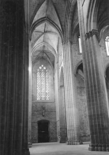 | Keywords: arquitectura gótico portugal batalha mosteiro santa vitória fundação calouste gulbenkian fundaçãocaloustegulbenkian maria pia mariapia mário tavares chicó máriotavareschicó mário novais márionovais gótica biblioteca de arte bibliotecadearte Interior da Igreja. Fotógrafo: Mário Novais, 1899-1967. Orientador científico: Mário Tavares Chicó, 1905-1966. Data aproximada da produção da fotografia original: 1954. O Mosteiro da Batalha é o mais importante símbolo da Dinastia de Avis. Ele foi construído por iniciativa de D. João I, na sequência de um voto à Virgem, caso vencesse a Batalha de Aljubarrota (1385). Ao longo do século XV, praticamente todos os monarcas aqui deixaram a sua marca. O arranque das obras deu-se em 1388 e foi conduzido por Afonso Domingues, que se manteve à frente do estaleiro até 1402, ano em que faleceu. A ele se atribui o plano geral da construção e o grande avanço dos trabalhos na igreja e no claustro. Não terá tido tempo de executar a fachada principal nem o abobadamento do templo, deixando igualmente inacabado o claustro. A magnífica igreja de três naves e transepto saliente por si delineada, com cabeceira de cinco capelas, sendo a central de duplo tramo e terminação poligonal, terá sido o ponto alto da sua carreira, mas revela bem o nível ainda algo arcaizante da arquitectura portuguesa de finais do século XIV, alheia aos progressos do Gótico Flamejante, que tanto iria marcar a segunda fase do monumento. Com efeito, a partir de 1402, a chefia do estaleiro foi entregue a Huguet, arquitecto de provável origem catalã que inaugurou, entre nós, o tardo-gótico. Documentado à frente do projecto até 1438, a ele se deve o abobadamento dos espaços da igreja e da Sala do Capítulo (onde experimentou, pela primeira vez, uma abóbada estrelada), a construção da Capela do Fundador e, ainda, o início das obras das Capelas Imperfeitas, bem como a conclusão da fachada principal, onde sobressai o portal axial. Este, é delimitado por um arco canopial que integra os escudos de D. João I e de D. Filipa. No tímpano, exibe-se Cristo em Majestade ladeado pelos Evangelistas e as arquivoltas são repletas de figurações que continuam pelas estátuas-colunas, ao abrigo de um complexo programa iconográfico. Mas a mais emblemática obra de Huguet é a Capela do Fundador. Ela foi concebida para panteão régio e sabemos que já se encontrava em obras em 1426. É um compartimento quadrangular que se adossa aos três tramos ocidentais da fachada lateral Sul e integra, ao centro, um esquema octogonal de suportes onde descarrega a abóbada estrelada, solução primeiro experimentada em Inglaterra, mas rapidamente difundida pela Europa. No circuito interior desta capela, colocou-se o túmulo duplo de D. João I e de D. Filipa, realização igualmente sem antecedentes no nosso país e que resulta de uma nítida influência da tumulária inglesa. Na capela repousam também os filhos do casal régio (como D. Henrique e o regente D. Pedro), de acordo com a decisão testamentária de D. João I em fazer deste espaço um efectivo panteão. Em 1436, D. Duarte decidiu edificar uma capela funerária para si próprio. O projecto então concebido por Huguet foi o mais arrojado da sua carreira na Batalha, privilegiando uma planta circular que, todavia, não viria a ser concluída pelo falecimento do mestre dois anos depois. Desta forma, e não obstante a intervenção de Mestre Martim Vasques, a construção cessou até ao reinado de D. Manuel e, mesmo nessa altura, não foi concluída, razão de esta parcela ser conhecida como as Capelas Imperfeitas. No reinado de D. Afonso V, edificou-se o segundo claustro do mosteiro. Ele resulta da intervenção do arquitecto Fernão de Évora e, estilisticamente, é uma obra que contraria o tardo-gótico de raiz flamejante, tendo-se optado deliberadamente pela austeridade arquitectónica, que rejeita até a inclusão de capitéis a marcar o arranque dos arcos. A Batalha teve outras fases construtivas igualmente relevantes, como o Manuelino ou o Renascimento. Todavia, a mudança dinástica verificada com D. Manuel privilegiou outros locais e, só no século XIX, o Mosteiro voltou a ser intervencionado, desta vez com o objectivo de restaurar o conjunto, campanha que se prolongou por meio século. (Fonte: IPPAR - tinyurl.com/5dmlfe) [CFT015.164.ic] Interior da Igreja. Fotógrafo: Mário Novais, 1899-1967. Orientador científico: Mário Tavares Chicó, 1905-1966. Data aproximada da produção da fotografia original: 1954. O Mosteiro da Batalha é o mais importante símbolo da Dinastia de Avis. Ele foi construído por iniciativa de D. João I, na sequência de um voto à Virgem, caso vencesse a Batalha de Aljubarrota (1385). Ao longo do século XV, praticamente todos os monarcas aqui deixaram a sua marca. O arranque das obras deu-se em 1388 e foi conduzido por Afonso Domingues, que se manteve à frente do estaleiro até 1402, ano em que faleceu. A ele se atribui o plano geral da construção e o grande avanço dos trabalhos na igreja e no claustro. Não terá tido tempo de executar a fachada principal nem o abobadamento do templo, deixando igualmente inacabado o claustro. A magnífica igreja de três naves e transepto saliente por si delineada, com cabeceira de cinco capelas, sendo a central de duplo tramo e terminação poligonal, terá sido o ponto alto da sua carreira, mas revela bem o nível ainda algo arcaizante da arquitectura portuguesa de finais do século XIV, alheia aos progressos do Gótico Flamejante, que tanto iria marcar a segunda fase do monumento. Com efeito, a partir de 1402, a chefia do estaleiro foi entregue a Huguet, arquitecto de provável origem catalã que inaugurou, entre nós, o tardo-gótico. Documentado à frente do projecto até 1438, a ele se deve o abobadamento dos espaços da igreja e da Sala do Capítulo (onde experimentou, pela primeira vez, uma abóbada estrelada), a construç