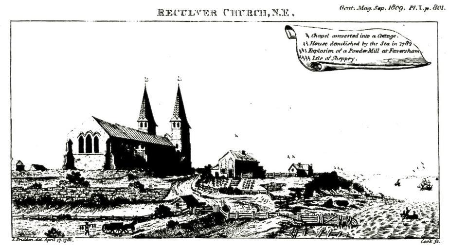 Keywords: Mot T Gents Mag 1809 Plate.jpg en View of Reculver church from the shore ENE 1781-04-17 Gentleman's Magazine September 1809 Pridden J PD-Art-100 Uploaded with UploadWizard Reculver Church