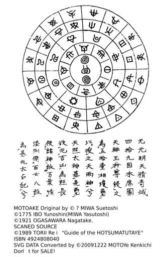 Keywords: Motoake.svg en MOTOAKE Original by © MIWA Suetoshi ©1775 IBO Yunoshin MIWA Yasutoshi ©1921 OGASAWARA Nagatake SCANED SOURCE ©1989 TORII Rei Guide of the HOTSUMATUTAYE ISBN 4-924808-04-0 SVG DATA Converted by ©20091222 MOTOYe Kenkichi This version is used to 600DPI or low Don t to SALE and commacial use For research commercial illustrations are not allowed For commercial use are please contact to possession of the original or contact to the http //woshite com/ Japan Institute Woshite <- To inquire about this upload please refrain ja モトアケ 600DPI以下で使用してください 研究用のため 図版の商用は不可です 商用に関しては原 を 持している方<ref name bpnono >http //blogs yahoo co jp/bpnono 高島市ホツマ研究会 野 直大 </ref>か http //woshite com/ 日 ヲシテ研究 にご 絡ください このアップロードに関してのお問い合わせはご遠慮ください 元元明天精奇城 四拾 因 席 天津神玉 尊之 為五拾壹相瓊璽 以授之天兩神兮 天照太神基是璽 欲兆吉凶為點長 使諸神詠萬葉情 添削撰百貳八詠 為基兆太占 兮 至譽田天皇御宇 三輪臣鳴鏑根命 譯註加千八拾字 至光仁天皇御宇 吉備大臣 備公 於水尾御 再註 加千貳百八拾字 至今世和仁估勇 復加千百廿四字 以翻譯之為 兮 テキストは浦 裕の入力を底 とした/http //miko org/~uraki/kuon/furu/text/sindaimonji/hotumatutae/futoimani01 htm 久遠の絆ファンサイト IN 台湾/フトマニ 神敕基兆傅太占書 鳥居礼ホツマツタエ入 (株式会社 興書院) 版 1989年 平成元年 3 3日 ISBN 4-924808-04-0 MOTOI Kenkichi 2009-12-22 <references /> PD-old Woshite Archives