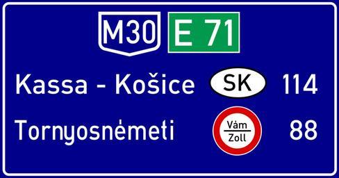 Keywords: Motoway distance sign.svg en Motorway distance road sign in Hungary own Rl91 2010-08-18 Diagrams of informatory road signs of Hungary Road signs in Hungarian language Stop at customs road sign