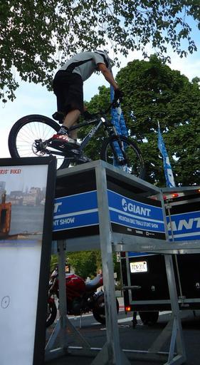 Keywords: Mountain bike stunt cyclist Chris Clark during a show.jpg en Professional stunt bicyclist Chris Clark climbs on to a one-story tall trailer using ramps jumps and precision balance He performed at a show in Summit New Jersey 2012-08-07 own Tomwsulcer cc-zero Consent Uploaded with UploadWizard Stunt bike Summit New Jersey Cycling in New Jersey |