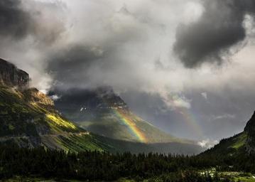 Keywords: mountain range valley rainbow clouds scenic landscape sunbeams sunset haze trees wilderness water stream outdoors hills grass view