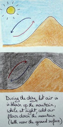 Keywords: Mountain wind.JPG en A schematic showing the wind direction at day and at night on mountains The direction changes as during daytime the mountain heats up more rapidly than the valley while at night the valley keeps its heat longer than the mountain The image was hand drawn based on an image in the book Wereldwijzer by Marshall Cavendish aswell as the image at http //media-2 web britannica com/eb-media/68/62668-004-8B29BAC5 gif own KVDP 2009-10-23 Wind diagrams diagram |