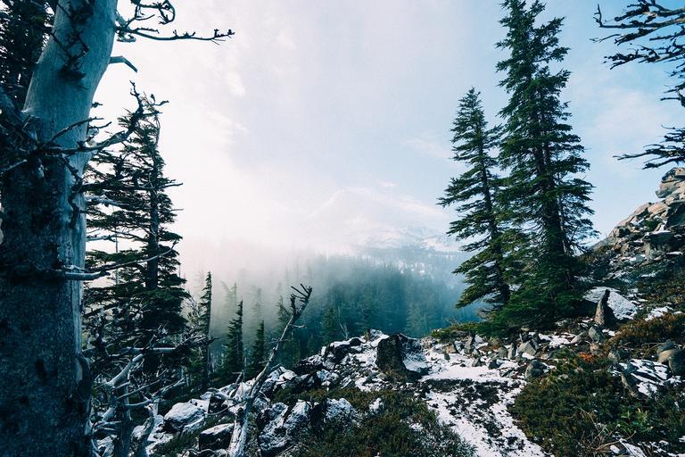 Keywords: mountains hiking misty foggy trees snow winter frosty cold nature adventure travel landscape trekking path outdoor trail backpacking forest woods sky clouds hills peaks