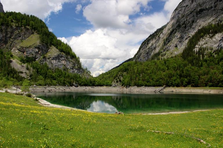 Keywords: mountains lake hiking alpine sky austria landscape bergsee meadow nature lake view mountain landscape mountain lake