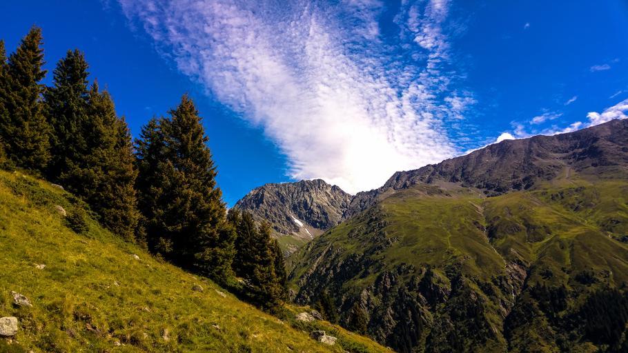 Keywords: mountains mountain panorama alpine panorama mountain range tyrolean alps blue sky firs trees austria