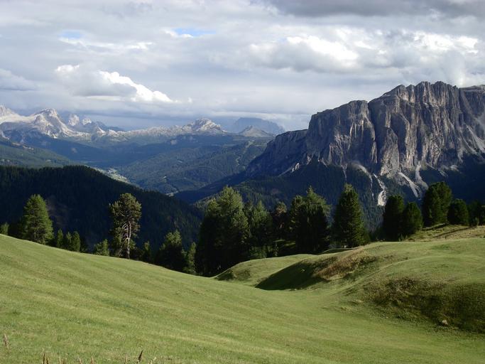 Keywords: mountains nature landscape meadow freedom green grass idyll rest holiday relaxation free holidays relax travel hiking hike dolomites italy wide mountain sky rock panorama