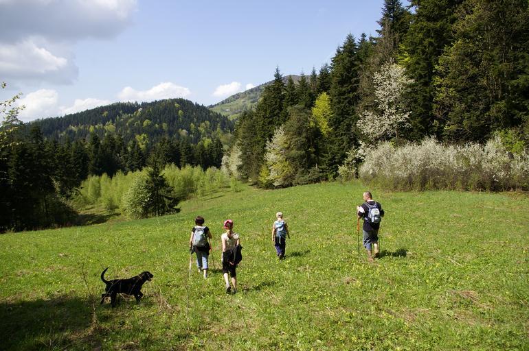 Keywords: mountains view tourism nature spring meadow forests green meadow
