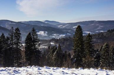 Keywords: mountains winter snow winter in the mountains tree forest nature poland highlander's cabin top view
