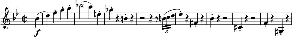 | Keywords: MozartSymph40Mvt4StartOfDevelopment.svg as the original Quotation in musical notation from Mozart's 40th symphony the opening of the development section of the last movement This music is in the public domain Please double-check the accuracy of this conversion before use in particular the accidental notation differs en wikipedia 2007-05-17 Klork wikipedia en Set in LilyPond then cropped converted to SVG using Adobe Illustrator The LilyPond source for this version is as follows <pre> \relative c set-accidental-style 'modern \time 2/2 \key g \minor s2 bes4\f d4 f- a- bes- des2 c4 e 4- aes4- r4 b 4- r4 r2 r4 r8 \times 2/3 b16 c d ees4- r fis - r bes4- r r2 cis 4- r r2 f4- r gis - r \version 2 10 23 </pre> Klork Original upload log as the original Quotation in musical notation from Mozart's 40th symphony the opening of the development section of the last movement This music is in the public do</nowiki> version lost KV 550 |