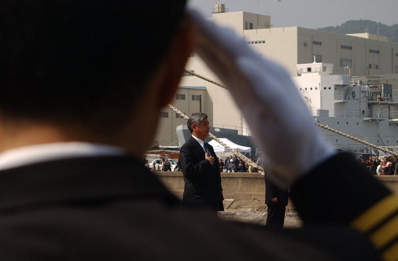 | Keywords: Mr. Nakatani at Sasebo Base, -16 Mar. 2002 b.jpg SASEBO March 16 2002 - Mr Nakatani Director General of the Japanese Defense Agency pays respect to the Japanese National Anthem during a homecoming reception of MSDF ships Kirisame Kurama and Hamana March 16 2002 Japan's MSDF have been in the Indian Ocean providing vital logistical support including supplying fuel to U S and coalition ships in the fight against terrorism 020316-N-HY254-007 Navy http //www defenseimagery mil/imagery html guid 7ca12fe8accee35fe82757e72a66a5bdba5e4840 2002-03-16 PH2 AW Jonathan R Kulp U S Navy PD-USGov-Military-Navy March 2002 photographs Gen Nakatani in 2002 People of the JMSDF JMSDF Sasebo Naval Base |