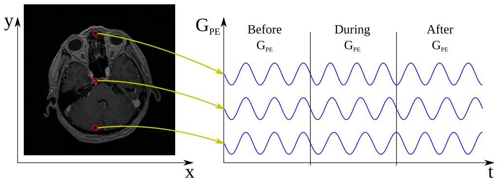 | Keywords: MRI Phase Encoding Principle.svg Uploaded with en wp UW marker 2013 07 03 For use in en Physics_of_magnetic_resonance_imaging Before applying phase encoding gradient all spins precess at the same frequency with the same phase When G_PE is turned on the spins start precessing at different frequencies After G_PE is turned off spins are no longer in phase and the phase is linearly dependent on y position Drawn using Inkscape 0 48 3<br/> 2013-07-03 Dzenanz ;Other information I created it for my PhD thesis which I am currently writing cc-zero Magnetic resonance imaging |