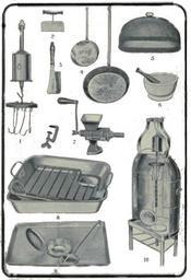 | Keywords: Mrs. Beeton's Book of Household Management (93).jpg en This is the image displayed on page 93 in Mrs Beeton's Book of Household Management by Isabella Beeton The image depicts a variety of common kitchen utensils Bottle Roasting Jack Mincing Knife or Suet Chopper Meat Chopper Frying Pans Wire Meat Cover Pestle and Mortar Mincing or Sausage Machine with Table Clamp Double Baking Pan with Meat Stand Drip Pan with Basting Ladle Bottle Jack Roasting Screen 2012-08-05 Printed in 1907 version File Mrs Beeton's Book of Household Management Part 1 djvu Isabella Beeton PD-old-100 Uploaded with UploadWizard Mrs Beeton's Book of Household Management Kitchen utensils |
