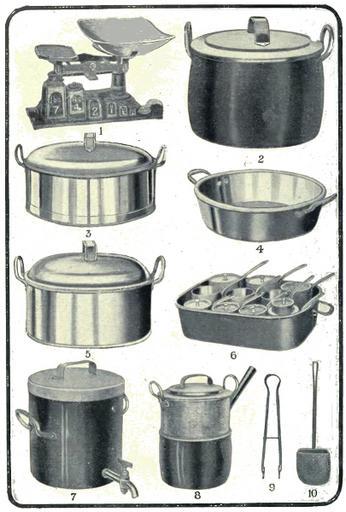 | Keywords: Mrs. Beeton's Book of Household Management (94).jpg en This is the image displayed on page 94 in Mrs Beeton's Book of Household Management by Isabella Beeton The image depicts a variety of common kitchen utensils Household Weighing Machine Oval Boiling Pot Turbot Kettle Copper Preserving Pan Fish Kettle Bain-Marie Pans Iron Stockpot with Tap Saucepan and Steamer Steak Tongs Fish Slice Printed in 1907 version File Mrs Beeton's Book of Household Management Part 1 djvu Isabella Beeton PD-old-100 Uploaded with UploadWizard Mrs Beeton's Book of Household Management Kitchen utensils |