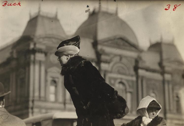 | Keywords: Mrs. John Rogers 156010v.jpg This photograph shows Mrs John Rogers sister-in-law of former Secretary of War Stimpson Stimson and a member of the Advisory Council of the Congressional Union for Women Suffrage speaking Summary Open-air photograph of Elizabeth S Rogers speaking half-length in profile wearing fur coat and hat A man in bowler hat and a woman in hat with scarf securing it to her head partially visible in lower left and lower right corners of print Building Corcoran Museum of Art in background Elizabeth S Rogers Mrs John Rogers Jr of New York City was the wife of a prominent thyroid specialist and a descendent of Roger Sherman signer of the Declaration of Independence She was a civic reformer working to improve New York public schools and win suffrage in the state of New York before joining the national suffrage movement She was chairman of the Advisory Council of the NWP and one of the most forceful speakers in the Prison Special tour of the country during which suffragists spoke of experience in jail She was arrested July 14 1917 picketing the White House and was sentenced to 60 days in Occoquan Workhouse but was pardoned by President Woodrow Wilson after three days Source Doris Stevens Jailed for Freedom New York Boni and Liveright 1920 367 Buck Photographer 1913 Mar Back of print is labeled by hand in pencil Mrs John Rogers--speaking in front of old Corcoran Art Gallery and on front in red pen Buck 32 Rogers was the sister-in-law of Henry Lewis Stimson 1867-1950 Title transcribed from item 1 photograph print 4 5 x 6 5 in accession number Call Number Location National Woman's Party Records Group I Container I 156 Folder Rogers Elizabeth S Mrs John Source Collection Records of the National Woman's Party institution Library of Congress Manuscript Division http //hdl loc gov/loc mss/mnwp 156010 PD-old suffragettes March 1913 in Washington D C Fur fashion in 1913 Renwick Gallery |