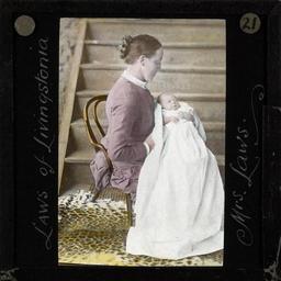 Keywords: Mrs Margaret Laws, Malawi, 1886 (imp-cswc-GB-237-CSWC47-LS5-1-021).jpg en <br> Mrs Margaret Laws Malawi 1886 Photograph of Mrs Margaret Laws nee Gray wife of Dr Robert Laws Margaret Laws is pictured sitting on a chair holding a young infant likely Dr and Mrs Law's daughter Amelia Nyasa Laws born in 1886 There is a wooden stair case in the background and a leopard skin rug on the floor ; This belongs to a series of Church of Scotland Foreign Missions Committee lantern slides relating to Dr Robert Laws 1851-1934 the Scottish Missionary In 1875 inspired by David Livingstone 1813-1873 Laws travelled to Malawi and was involved in the foundation of the mission station of Livingstonia on the shores of Lake Nyasa During the succeeding 50 years he also established a network of hundreds of schools In 1908 Laws was elected moderator of the General Assembly of the United Free Church of Scotland Photographer Unknown Subject personal name Laws Robert 1851-1934 Filename imp-cswc-GB-237-CSWC47-LS5-1-021 tif Coverage date 1875/1925 Part of collection International Mission Photography Archive ca 1860-ca 1960 Type images Part of subcollection Photographs from the Centre for the Study of World Christianity University of Edinburgh U K ca 1900-ca 1940s Repository name Centre for the Study of World Christianity Archival file impaunpub_Volume7/1524 url Repository address The University of Edinburgh School of Divinity New College Mound Place Edinburgh EH1 2LX United Kingdom Geographic subject country Malawi Format aacr2 1 lantern slide 8 x 8 cm Geographic subject continent Africa Rights Contact the repository for details Part of series Laws of the Pioneer LS5/1 Repository email divinity-CSWC ed ac uk Subject lcsh Keyword Women; Children Date created 1875/1925 Publisher of the digital version University of Southern California Libraries Subject aat genre portraits Format aat lantern slides Legacy record ID impa-m68582 Access conditions http //www ed ac uk/schools-departments/divinity/research/centres/world-christianity/collections-resources File GB 237 CSWC47/LS5/1/21 1875/1925 author http //digitallibrary usc edu/cdm/ref/collection/p15799coll123/id/64645 PD-old-70-1923 Magic lantern images Images from USC Digital Library uploaded by Fæ International Mission Photography Archive ca 1860-ca 1960 |