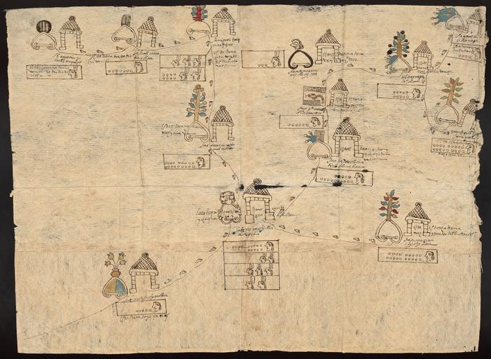 | Keywords: Muchitlan, Tlaxcala, Mexico WDL407.png Artwork ru очитлан Тласкала ексика fr Muchitlan Tlaxcala au Mexique en Muchitlan Tlaxcala Mexico zh 墨西哥特拉斯卡拉莫奇特兰 pt Mochitlán Tlaxcala México ar موشيتلان، تلاكساكالا، المكسيك ru Эта ка та найденная в Зумпанго-дель-Рио на те ито ии сов еменного штата Ге е о ексика является частью соб ания Relaciones Geográficas Геог афических сообщений Латиноаме иканской коллекции Бенсона х анящейся в Униве ситете штата Техас в Остине Относящиеся к пе иоду с 1578 по 1586 гг Геог афические сообщения п едставляют собой ответы на оп осники введенные испанскими ко олевскими властями в 1577 г для получения инфо мации о захваченных испанцами те ито иях в Севе ной и Южной Аме ике Оп осники охватывали такие темы как демог афия политическое уп авление языки физические особенности местности астительность Ко олевские власти получили 191 ответное послание на эти оп осники Из сох анившихся до нашего в емени 167 ответных посланий 43 находятся в Латиноаме иканской коллекции Бенсона Остальные х анятся в А хиве Индий в Севилье и в Ко олевской исто ической академии в ад иде Сообщения соде жат важную инфо мацию по исто ии культу е и геог афии овой Испании XVI века ногие оп осники дополнены ка тами и исунками Они п едоставляют ценную инфо мацию по таким воп осам как экономика колоний и асп ост анение ев опейской елигии в овой Испании а также являются а тефактами для изучения исто ии латиноаме иканского искусства и изоб ажений в укописях Эта ка та дати ованная 7 ма та 1582 г снабжена коммента иями на науатле языке ацтеков на испанском языке и на местном языке изоб ажений <br>Искусство мексиканское; Искусство ацтеков; Рукописные ка ты; овая Испания; Иллюст и ованные ка ты; Испания Колонии fr Cette carte de Zumpango del Río dans l'actuel État de Guerrero au Mexique est issue de la collection Relaciones Geográficas de la collection latino-américaine de Benson de l'Université du Texas à Austin Datées entre 1578 et 1586 les Relaciones Geográficas représentent les réponses à des questionnaires émis par la Couronne d'Espagne en 1577 et demandant des informations à propos des territoires espagnols des Amériques Les questionnaires traitaient des sujets tels que la démographie l'administration politique les langues parlées la physionomie des terres et la végétation La Couronne reçut 191 réponses à ces questionnaires Parmi les 167 réponses dont l'existence est connue 43 font partie de la collection latino-américaine de Benson Les autres sont conservées aux Archives générales des Indes à Séville et à l'Académie royale d'histoire à Madrid Les « relaciones » contiennent des informations historiques culturelles et géographiques importantes concernant la Nouvelle-Espagne au cours du XVIe siècle Bon nombre de questionnaires sont accompagnés de cartes et d'illustrations Celles-ci transmettent des informations à propos de sujets tels que l'économie coloniale et l'expansion de la religion européenne en Nouvelle-Espagne et font l'objet de l'étude de l'histoire de l'art et de l'enluminure latino-américaine Cette carte datée du 7 mars 1582 comprend des commentaires en nahuatl langue des Aztèques en espagnol et en langue picturale indigène <br>Art mexicain; Art aztèque; Cartes manuscrites; Nouvelle-Espagne; Cartes picturales; Espagne--Colonies en This map from Zumpango del Río in the present-day state of Guerrero Mexico is from the Relaciones Geográficas collection in the Benson Latin American Collection at the University of Texas at Austin Dating from between 1578 and 1586 the Relaciones Geográficas are responses to a questionnaire initiated by the Spanish crown in 1577 requesting information about Spanish-held territories in the Americas The questionnaires covered such topics as demographics political administration languages spoken physical terrain and vegetation The crown received 191 responses to these questionnaires Of the 167 responses known to exist 43 are in the Benson Latin American Collection The others are held at the Archivo General de Indias Seville and the Real Academia de la Historia Madrid The relaciones contain important historical cultural and geographical information about New Spain during the 16th century Many of the questionnaires are accompanied by maps and pictures These both convey information about such topics as the colonial economy and the spread of European religion in New Spain and are artifacts for the study of the history of Latin American art and manuscript painting This map dated March 7 1582 has glosses in Nahuatl the language of the Aztecs Spanish and native pictorial language <br>Art Mexican; Aztec art; Manuscript maps; New Spain; Pictorial maps; Spain--Colonies zh 这幅奇尔