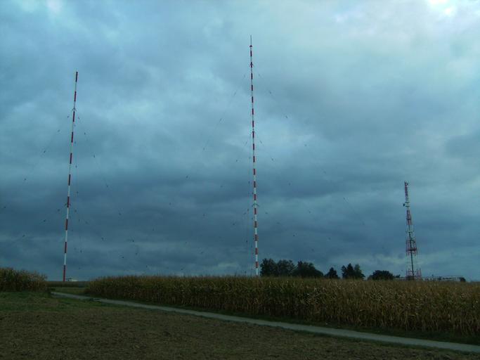 Keywords: Muehlacker radio masts2.JPG en Radio masts of Mühlacker transmitter Left Backup transmission mast height 130 metres Middle Main transmission mast height 273 metres Right Directional radio tower height 93 metres Own Zonk43 2009-09-13 Mühlacker transmitter |