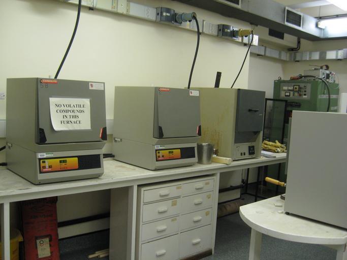 Keywords: Muffle furnaces.jpg en A row of furnaces in a science laboratory In the foreground are four muffle furnaces three are facing towards the camera and one to the right of the image is facing away The black cables descending from the conduit on the wall are the 415 V power cables which supply the furnaces The maximum temperature of these furnaces is approximately 1400 °C In the far corner of the room part of an induction furnace is visible The wooden handle visible near the muffle furnace facing away from the camera belongs to a set of metal tongs used to handle hot crucibles 2011-12-09 own Brammers cc-zero Uploaded with UploadWizard Furnaces Scientific equipment |