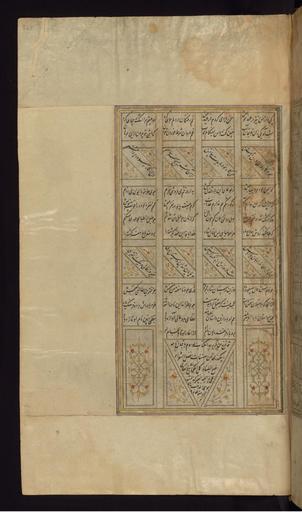 Keywords: Muhammad Musá al-Mudhahhib - Colophon - Walters W606368A - Full Page.jpg This folio from Walters manuscript W 606 contains 1 of 6 colophons in Arabic with the name of the scribe The colophons are dated to show that the various poems of the Khamsah were not executed consecutively; dates as follows 29 Dhu al-Hijjah 923 AH fol 32a ; 7 Rabi' I 924 AH fol 113a ; Safar 924 AH fol 169a ; 6 Dhu al-Hijjah 923 AH fol 234a ; 19 Muharram 924 AH fol 320a ; 5 Muharram 924 AH fol 368a 923-924 AH/AD 1517-1518 ink pigments laid paper cm 29 5 17 accession number W 606 368A 83103 Henry Walters Baltimore date and mode of acquisition unknown Walters Art Museum Henry Walters Acquired by Henry Walters Transliteration place of origin Iran Walters Art Museum license 2D Khamsa of Nizami Safavid Walters MS 606 Media contributed by the Walters Art Museum needs category review |