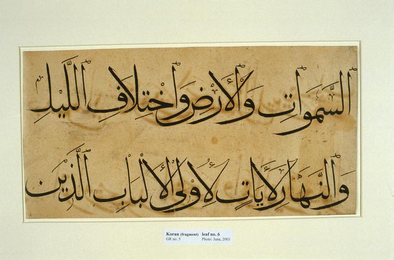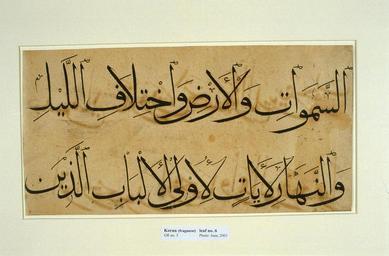 | Keywords: Muhaqqaq script - Qur'anic verses.jpg  en Parts of verses 190-191 of the 3rd chapter of the Qur'an entitled Surat Al 'Imran The Family of 'Imran The text is executed in a crisp and fully vocalized muhaqqaq script on a light beige paper and may have been executed in Persia or Central Asia during the early 15th century LOC-calligraphy ascs 284 Unknown Calligrapher century 15 PD-Art Muhaqqaq style Qur'an manuscripts 15th century Library of Congress Arabic Persian and Ottoman calligraphy collection |