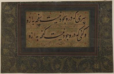 | Keywords: "Munajat" of 'Abdallah Ansari WDL159.png Artwork ru алик Дайлами fr Malik Daylami en Malik Daylami zh 马里克(多乐美) pt Malik Daylami ar مالك ديلمي es Malik Daylami ru унаджат Абдаллаха Анса и fr Les Munajat d'Abdallah Ansari en Munajat of 'Abdallah Ansari zh 阿布 拉·安沙里的 pt Munajat de 'Abdallah Ansari ar مناجاة لعبد الله أنصاري ru Этот ф агмент каллиг афии включает из ечение из <i> унаджата</i> олитв великого пе сидского мистика и ученого Хаджи Абдаллаха Анса и уме в 1088 г В этих двух ст оках описываются плоды молитвы и щед ости Ст оки текста выполнены че ным <i>ш ифтом насталик </i>на бежевой бумаге в об амлении изящных облакооб азных полос на позолоченном фоне Полоса текста об амлена множеством азнооб азных к омок и наклеена на лист пу пу ной бумаги ук ашенной золотыми пе еплетениями с цветочными мотивами ежду двумя основными ст оками текста и под ними п иведена надпись следующего соде жания Боже все боятся Тебя но Абдаллах боится себя ибо все доб ое исходит от Тебя а все злое от Абдаллаха т е слуги Божьего В этом к атком п едложении авто восхваляет Божью щед ость и благость С азу после восхваления Богу стоит подпись каллиг афа машк-и алик сочинение алика Именем алик очевидно называл себя каллиг аф алик Дайлами служивший п авителю династии Сафавидов шаху Тахмаспу кото ый п авил с 1524 по 1576 год <br>А абская каллиг афия; Иллюмини ование укописей; Исламская каллиг афия; Исламские укописи; Письмо насталик fr Ce fragment de calligraphie comprend une maxime tirée des <em>Munajat</em> Supplications du grand savant et mystique persan Khawadja Abdallah Ansari mort en 1088 Les deux lignes décrivent les bienfaits de la prière et de la générosité Elles sont rédigées en noir<em> </em>en écriture nastaliq sur papier beige et encadrées par des bandes nuageuses délicates sur un fond d'or lumineux Le panneau du texte est encadré par diverses bordures et collé sur une feuille de papier violet décorée de motifs de fleurs entrelacées dorées Entre et sous les deux principales lignes du texte on peut lire l'inscription suivante « Dieu tout le monde Te craint mais Abdallah se craint lui-même parce que tout ce qui est bon vient de Toi et tout ce qui est mauvais vient d'Abdallah « le serviteur de Dieu » » Cette petite phrase loue la munificence et la bonté de Dieu Immédiatement après cette louange se trouve la signature du calligraphe mashq i-Malik composition de Malik Malik pourrait être le calligraphe Malik Daylami qui fut au service du souverain safavide Shah Tahmasp au pouvoir de 1524 à 1576 <br>Calligraphie arabe; Enluminures; Calligraphie islamique; Manuscrits islamiques; Écriture nastaliq en This calligraphic fragment includes a maxim drawn from the <em>Munajat</em> Supplications of the great Persian mystic and scholar Khwajah 'Abdallah Ansari died 1088 The two lines describe the benefits of prayer and generosity The two lines of text are executed in black <em>nasta'liq </em>script on beige paper and framed by delicate cloud bands on a gold illuminated background The text panel is framed by a variety of borders and pasted to a sheet of purple paper decorated with gold interlacing flower motifs Between and below the two main lines of text appears an inscription reading God everyone fears You but 'Abdallah fears himself because everything that is good comes from You and everything that is evil comes from 'Abdallah i e 'the servant of God' This diminutive sentence serves as the author's praise of God's munificence and kindness Immediately after the praise of God appears the calligrapher's signature mashq-i Malik 'composition of Malik' Malik may be identified as the calligrapher Malik Daylami who was in the service of the Safavid ruler Shah Tahmasp who reigned from 1524 to 1576 <br>Arabic calligraphy; Illuminations; Islamic calligraphy; Islamic manuscripts; Nasta'liq script zh 这书写的片段包括摘自伟大的波斯神秘主义学 赫瓦 赫·阿 拉·安萨里(1088 年 世) 品 <i> Munajat </i> (祈祷)的 句格 两行文字描述了祈祷与慷慨的益处 两行文字为黑色 <i>波斯体 </i>手迹,纸张为褐色纸张,裱框为金色反光背景上的精致云彩状图案 文字镶 的裱框为各种不同的边纹,并贴 金色交错花 图案装饰的紫色纸张上 两行文字之间以及下方的文字内容为: 上 ,每个人都害 你,但阿 拉却害 他自己,因为 切美好的食物都是为你 赐, 切邪恶的食物却 自阿 拉(上 的仆人) 这 短词语是 对上 的慷慨与善良的赞美 对上 的赞美词之后是书法家的签名: mashq-i Malik (马利克 ) 马利克也可称之为书法家马利克·多乐美, 务于萨 王 统治 瑟尔汗·太美斯普(执政于 1524-1576 年间 ) <br>阿拉伯文书法; 插图; 伊斯兰书法; 伊斯兰手稿; 波斯体书法 pt Este fragmento da caligrafia inclui uma máxima extraída do <i>Munajat</i> Súplicas do grande místico e erudito Persa Khwajah 'Abdallah Ansari morreu 1088 As duas linhas descrevem os benefícios da oração e da generosidad