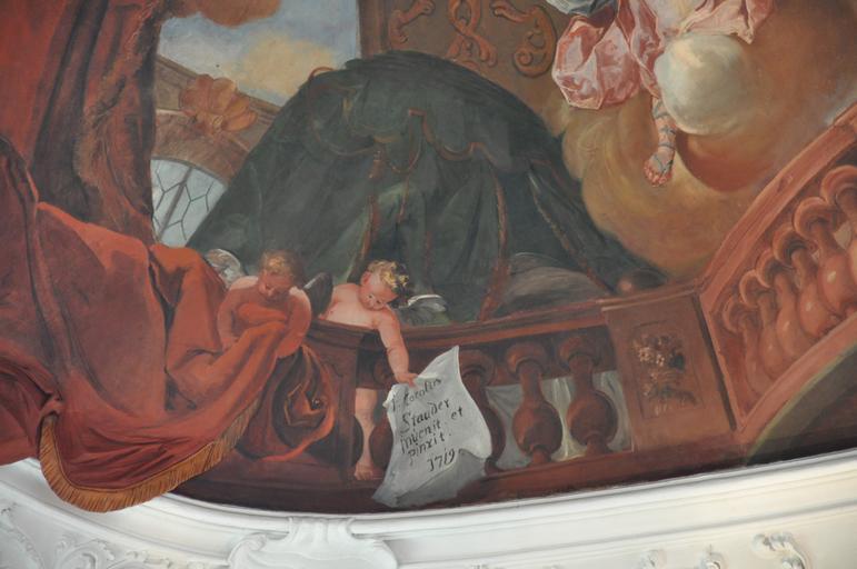 Keywords: Münsterlingen Klosterkirche A002 Kuppel Signatur.jpg Münsterlingen ehemalige Klosterkirche St Remigius Deckengemälde von Jacob Carl Stauder 1718 “1719 Mariä Verkündigung Onken Nr A2 ; Secco-Technik kein Fresko ; Detail Signatur mit Jahreszahl 1719 own own photograph 2014-05 Creator Jacob Carl Stauder Photo Andreas Praefcke Photos by User AndreasPraefcke Ceiling paintings in St Remigius Münsterlingen 1719 paintings Signatures of painters from Switzerland Stauder |