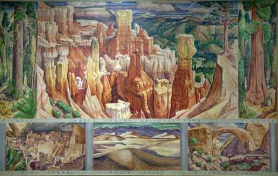 Keywords: Mural- Themes of the National Parks (Olympic, Bryce Canyon National Park, Sequoia, Mesa Verde, Death Valley, and Rainbow Bridge), by David McCosh at the Department of Interior, Washington, D.C LCCN2013634341.tif 1 photograph digital tiff file color Notes Date 1940; dimensions 4' 6 x 11' 8 1/2 ; medium oil ; Gift; Carol M Highsmith; 2009; DLC/PP-2009 083 ; Photographed as part of an assignment for the General Services Administration ; Title date and keywords from information provided by the photographer ; Forms part of Photographs in the Carol M Highsmith Archive ; Credit line Photographs in the Carol M Highsmith Archive Library of Congress Prints and Photographs Division 2011 Creator Carol M Highsmith Library of Congress Catalog http //lccn loc gov/2013634341 Image download https //cdn loc gov/master/pnp/highsm/24700/24734a tif Original url http //hdl loc gov/loc pnp/highsm 24734 No known restrictions on publication LOC-image highsm 24734 PD-Highsmith Images uploaded by Fæ Photographs by Carol M Highsmith |
