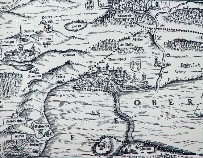 | Keywords: Murerplan - Oberes Zürichseegebiet IMG 2383.JPG obere Zürichseegebiet um Rapperswil SG mit den ausgedehnten Wäldern Rütner und Joner Wald auf der Karte von Josias Murer aus dem Jahr 1566 Nebst heutigen Gemeinden “ u a links Grüningen oben Bubikon und Rüti ZH rechts Jonen Jona SG unten Insel Ufenau und Hurden SZ “ sind die Rütner Weiler Hülistein Rüssel und Matten eingezeichnet Der Hüllistein Hohler Stein an der Strasse zwischen Rapperswil und Rüti war in jener Zeit weithin als ein Naturschauspiel bekannt ein Wasserfall unter einer Naturbrücke Deutlich eingezeichnet sind nebst anderen Details die Holzbrücke Rapperswil-Hurden und rechts die Jona Ione welche dem heutigen Ortsteil Jona seinen Namen gab <br>Beschreibung teilweise übernommen aus der Schautafel 36 Museen Stadtarchiv Rapperswil-Jona / fotografiert von einer Schautafel Grunau am 29 April 2009 1566 de Jos Murer upload by Roland zh PD-old-100 Third party works photographed by User Roland zh Kantonskarte Jos Murer Old maps of the canton of St Gallen 1566 in Switzerland Historical images of Holzbrücke Rapperswil “Hurden Historical images of Rüti Jona Fluss Historical images of Rapperswil-Jona Old maps of Rapperswil-Jona Hüllistein Wooden bridges in art Old maps of Zürichsee |