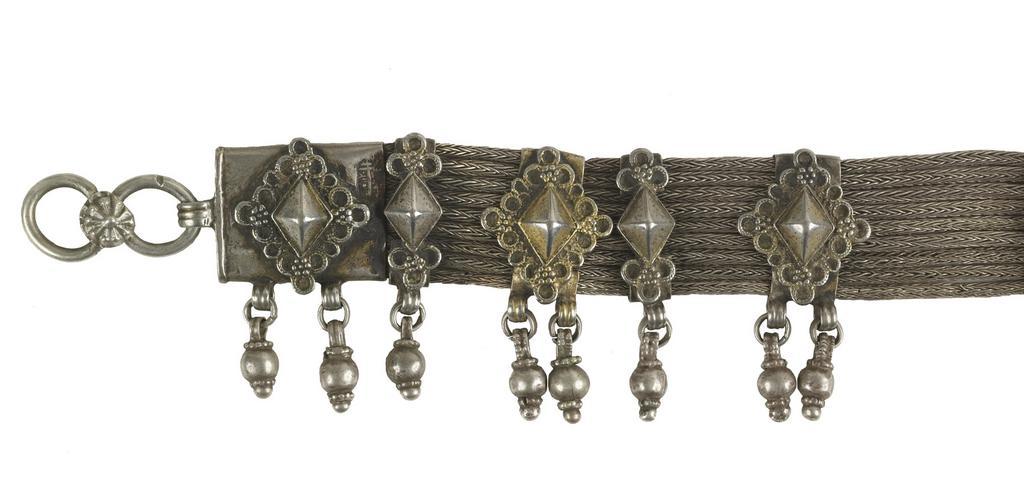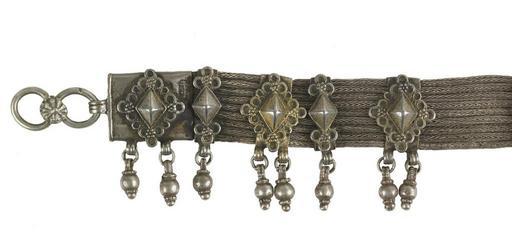 Keywords: Musa - Girdle - Walters 572325 - Detail A.jpg The girdle is made of a flexible interlace mesh and has eleven movable retainers with large rhombic attachments each with two tear-shaped pendants and twelve retainers with smaller rhombic attachments each with one pendant All attachments were cast Small rings and rosettes frame the large rhombic elements and three-ring motif with burling rosettes accompany the smaller ones at their top and bottom The clasps are also decorated with a large rhombic elements A wire shaped in a figure-eight with a rosette is used as a closing element On the front of the clasps is an Arabic stamp with the name of the ruler and a date al-Mahdi 1170 The similarity to stamps of al-Mahdi al- Abbas makes it likely that the pendants were produced under his reign from AH 1161 to 1189 AD 1748-1775 An engraved inscription on the back of the clasp names the silversmith Musa Iraqi For another object by Musa Iraqi see Walters 57 2321 1170 AH/AD 1756-1757 silver with gilding L 34 x W 1 in 86 3 x 2 6 cm accession number 57 2325 80929 Mr Benjamin Zucker Zucker Family Trust and Mr Derek Content New York and London by purchase Walters Art Museum Joint gift to the Walters Art Museum Baltimore and the Israel Museum Jerusalem by Mr Benjamin Zucker and Mr Derek Content in honor of Mrs Barbara Zucker and Mrs Amanda Content 2010 Stamp Arabic al-Mahdi 1170 Engraving Hebrew Musa Iraqi place of origin Yemen Walters Art Museum license Jewellery in the Walters Art Museum South Arabian art in the Walters Art Museum Musa Iraqi Media contributed by the Walters Art Museum needs category review |