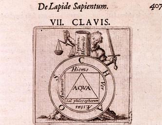 | Keywords: Musaeum Hermeticum 1678 VII Clavis AQ35 Key 7.tif Matthaeus Merian 1593 “1650 From Tripus aureus hoc est Tres tractatus chymici selectissimi nempe I Basilii Valentini benedictini ordinis monachi Germani practica una cum 12 clavibus et appendice ex germanico; II Thomae Nortoni angli philosophi crede mihi seu ordinale ante annos 140 ab authore seriptum nunc ex anglicano manuscripto in latinum translatum phrasi eujusque authoris ut et sententia retenta; III Cremeri cuiusdam abbatis westmonasteriensis angli testamentum hactenus nondum publicatum nunc in diversarum nationum gratiam editi et figuris cupro affabre incisis ornati operâ et studio Michaelis Maieri phil et med d com p c Francofurti apud Hermannum à Sande MDCLXXVII as published in the collection Musaeum hermeticum reformatum et amplificatum Francofurti Apud Hermannum à Sande 1678 In Latin The part in question 'I Basilii Valentini benedictini ordinis monachi Germani practica una cum 12 clavibus et appendice ex germanico;' or 'Basil Valentine a German monk of the Benedictine order one study with the twelve keys and the appendix translated from the German ' A woman holds scales in her right hand and a sword in her left and stands behind a large flask the neck of which reads Sigilum Hermelis the Seal of Hermes The vessel is labelled CHAOS Within it is a circle labelled with the four seasons Hiems Ver Æstas Autumno around a square marked Sal philosophorum Salt of the Philosophers inside of which a triangle is inscribed with AQVA water http //othmerlib chemheritage org/record b1035996~S6 Catalog Information From the copy in the Roy G Neville Historical Chemical Library http //www chemheritage org/ Chemical Heritage Foundation Downloaded with permission from the Chemical Heritage Foundation as part of the Wikipedian in Residence initiative Chemical Heritage Foundation http //www chemheritage org/ Chemical Heritage Foundation 1678 PD-old-100 PD-old-100 cc-by-3 0 Chemical Heritage Foundation Category Alchemy Musaeum Hermeticum Archives Images from the Chemical Heritage Foundation Twelve Keys of Basil Valentine PD-old-100 |