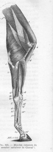 Keywords: MusclesMbreCranExtChevalChauveau1890CM.jpg en The external muscles of the foreleg of the horse Equus caballus fr Les muscles externes du membre antérieur du Cheval Equus caballus <br /> 1 deltoïde long abducteur du bras 2 supra-épineux sus-épineux 3 infra-épineux sous-épineux 3' son tendon d ™insertion 4 court abducteur du bras 5 biceps brachial 6 brachial cranial brachial antérieur 7 chef long du triceps brachial long anconé gros extenseur de l ™avant-bras 8 chef latéral du triceps brachial anconé externe court extenseur de l ™avant-bras 9 anconé 11 extenseur radial du carpe extenseur antérieur du carpe 12 aponévrose qui sépare ce muscle du brachial antérieur 13 extenseur oblique du carpe 14 extenseur dorsal antérieur des phalanges 15 la petite branche tendineuse qu ™il fournit à l ™extenseur latéral 16 extenseur latéral des phalanges 17 la bride fibreuse qu ™il reçoit du carpe 18 ulnaire latéral cubital latéral fléchisseur externe du métacarpe 19 son tendon métacarpien 20 son tendon sus-carpien 21 chef olécrânien du fléchisseur profond des phalanges portion cubitale du perforant 22 tendon du perforant 23 sa bride carpienne 24 sa gaine de renforcement phalangienne 25 tendon du perforé <br /> ” Chauveau Auguste Arloing Saturnin Traité d ™anatomie comparée des animaux domestiques <br />Lib J B Baillière et Fils Paris 1890 1064 pp page 315 domaine public décès des auteurs 1917 et 1911 Meyer Ch 2011-04-04 PD-old Horse leg anatomy Horse muscles Forelimbs |