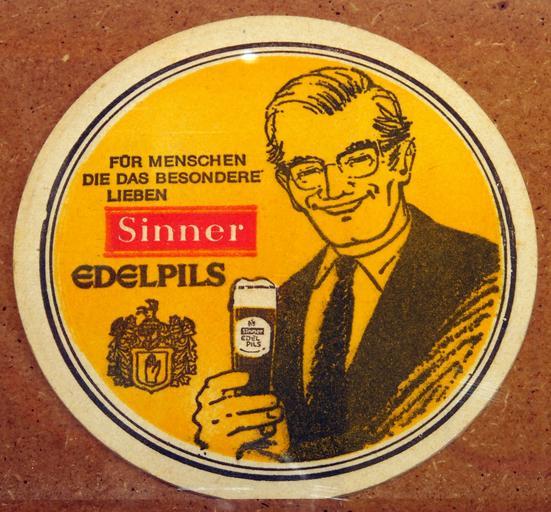 Keywords: Musée Européen de la Bière, Beer coaster pic-047.JPG Sinner Edelpils Photographed through glass own 2012-08-16 16 14 19 AlfvanBeem CC-zero Trademarked Musée Européen de la Bière Nostalgia by Alf van Beem Beermats