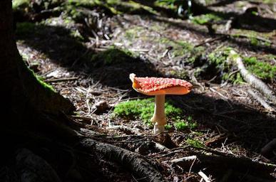Keywords: mushroom fly agaric red fly agaric mushroom fungal species toadstool gift toxic red white hat stalk points spotted lamellar moss forest forest floor autumn nature light shadow shadow play