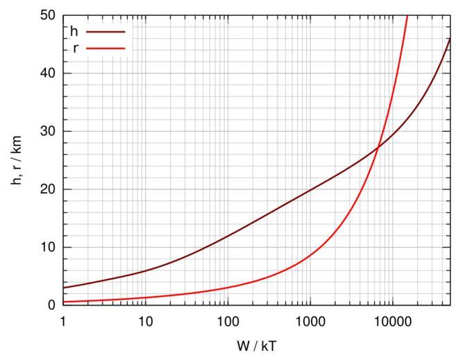 | Keywords: Mushroomcloud Size.svg en Final height h and radius r of a nuclear mushroom cloud as a function of the explosive yield W The final height is approximately the height above the burst point for low and intermediate W and approx the height above sea leval for high W Quelle Glasstone Dolan 1977 numerical approximation of original graph de Endhöhe und Radius der Pilzwolke einer Kernwaffenexplosion als Funktion der Sprengkraft W Die Endhöhe ist ungefähr die Höhe über dem Detonationspunkt für geringe und mittlere W und ungefähr die Höhe über Meeresniveau für große W Quelle Glasstone Dolan 1977 numerische Näherung des Originalgraphen Own SiriusB 2008-11-21 Image Mushroomcloud Size png The graph can be reproduced with Gnuplot version 4 2 or higher using this script reset lw1 2 0; lw2 2 0; lw3 1 ; lw4 0 5 set term svg enhanced size 600 450 font Helvetica 14 ;set output 'cloud svg' ch 3 0 scaling factor for height cw 0 6 scaling factor for radius f lx 0 006941 lx 4-0 06216 lx 3+0 1526 lx 2+0 1878 lx log height g lx 0 0137 lx 3-0 0358 lx 2+0 37 lx log radius h lx ch 10 f lx r lx cw 10 g lx h0 lx ch 10 lx/3 r0 lx cw 10 lx/3 clx 0 75;dlx 0 2 smooth interpolation via Fermi-Dirac function tau lx 1 / exp clx-lx /dlx +1 other interpolations are possible uat lx 1 -tau lx hsw lx tau lx h lx +uat lx h0 lx rsw lx tau lx r lx +uat lx r0 lx set logscale x; set logscale x2 set xrange 1 50000; set xtics 10; set mxtics 10 set yrange 0 50; set ytics 10; set mytics 5 set grid xtics ytics mxtics mytics back lt 1 lw 0 5 lc rgb ' 808080' lt 1 lw 0 5 lc rgb ' b0b0b0' set key left Use slanted fonts for variables if available set xlabel ' /Oblique W / kT'; set ylabel ' /Oblique h /Oblique r / km' set xlabel 'W / kT'; set ylabel 'h r / km' plot hsw log10 x t ' /Oblique h ' w l lt 1 lw lw1 lc rgb ' 770000' \ rsw log10 x t ' /Oblique r ' w l lt 2 lw lw1 lc rgb ' ff0000' reset Nuclear explosion physics Mushroom clouds SVG diagrams |