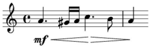 Keywords: Music hairpins.png Hairpins in musical notation Image made with GNU LilyPond and released into the public domain LilyPond source <pre> \version 2 2 0 staffline \new Staff \time 4/4 \clef treble \notes \relative c a4 \mf\< gis16 a c4 \ \> b8 a4\ \score \staffline \paper indent 0 0\mm raggedright t </pre> Transferred from http //en wikipedia org en wikipedia 2004 05 23 first uploaded ; Camembert at http //en wikipedia org en wikipedia Released into the public domain by the author 150px 150px Music_hairpins svg en wikipedia Camembert Original upload log page en wikipedia Music_hairpins png 2004-05-23 18 56 Camembert 285×91× 2345 bytes <nowiki>less ugly version courtesy Lilypond</nowiki> Hairpins |